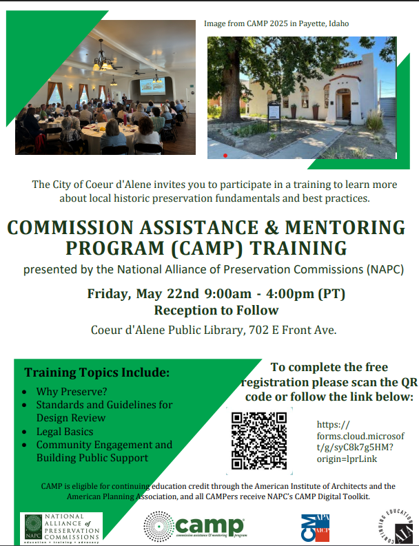 Learn more about historic preservation fundamentals and best practices at the Commission Assistance & Mentoring Program (CAMP) Training, with eligible continuing education credit through the American Institute of Architects and the American Planning Association.