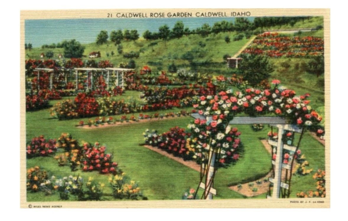 Historic postcard of the Caldwell Rose Garden, in Caldwell, Idaho